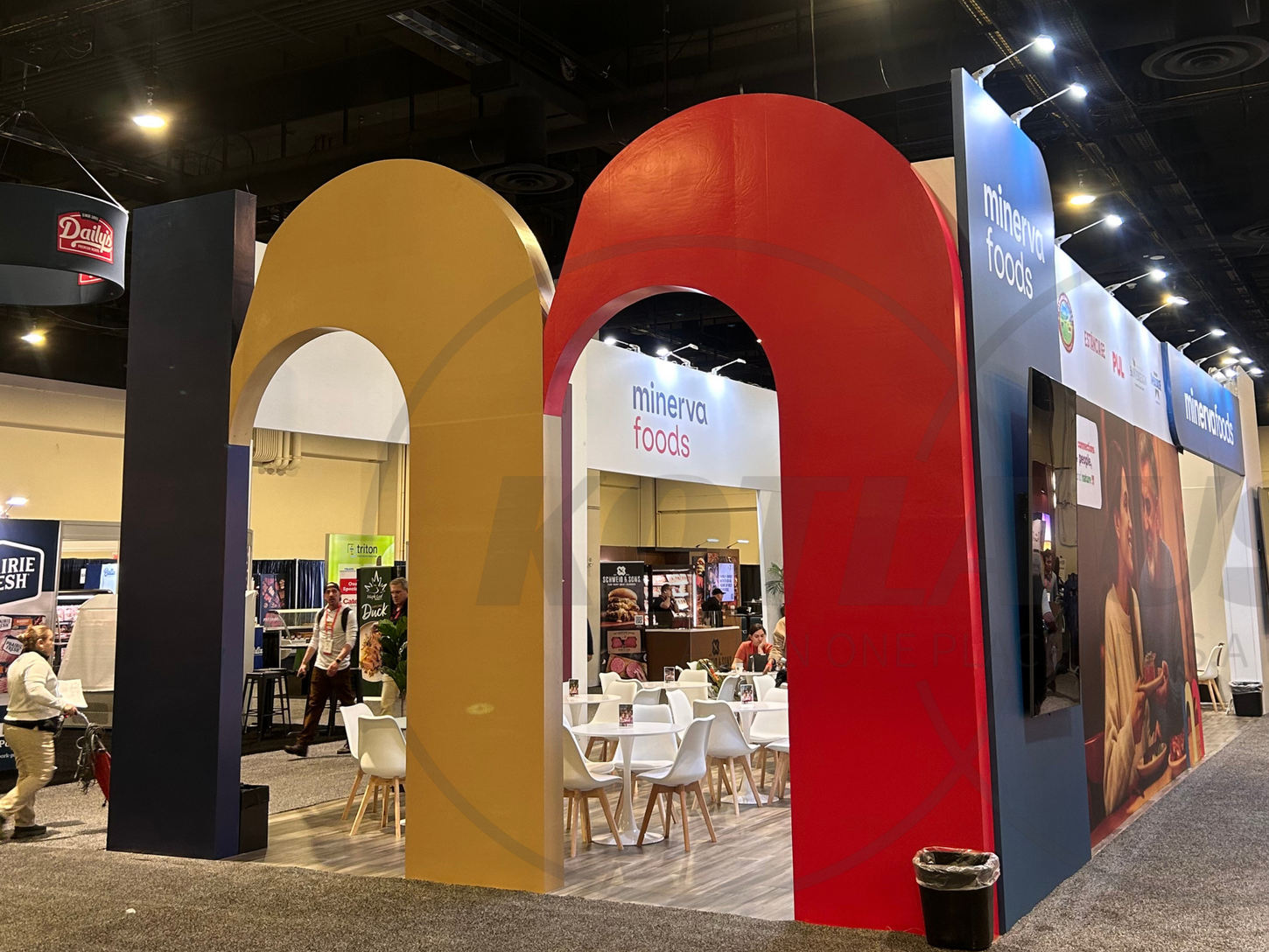 A key architectural highlight was the series of bold, freestanding arches inspired by the brand’s signature identity elements. These colorful structures not only created a strong visual impact but also symbolized Minerva Foods’ global reach and cultural diversity. The integrated country flag graphics further reinforced the company’s international footprint.